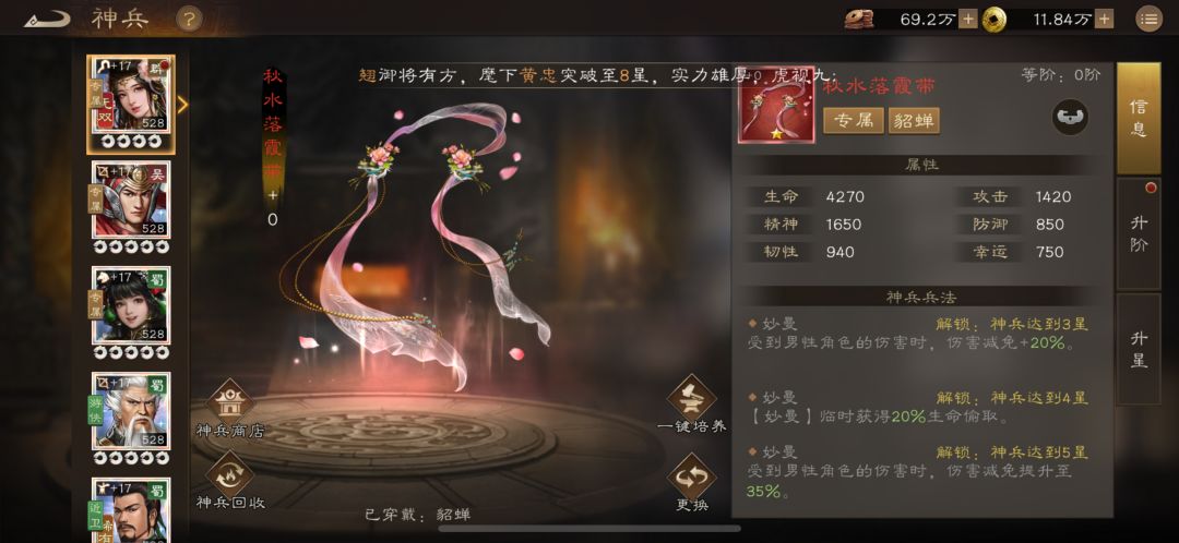 · 神器培养:貂蝉的专属神器“秋水落霞带”至关重要。3星是质变点,能获得受到男性伤害减伤20% 的关键生存能力;5星时减伤提升至35%,让她在男性主导的战场中更加稳固。