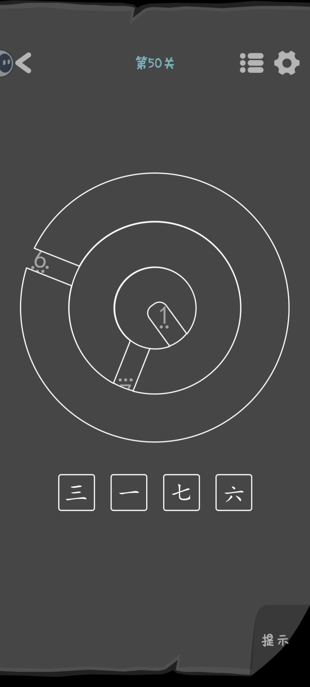 第50关 转动每个圆圈里的小长条,找到密码。还是一样,数字旁边有几个点就表示是第几位的密码。