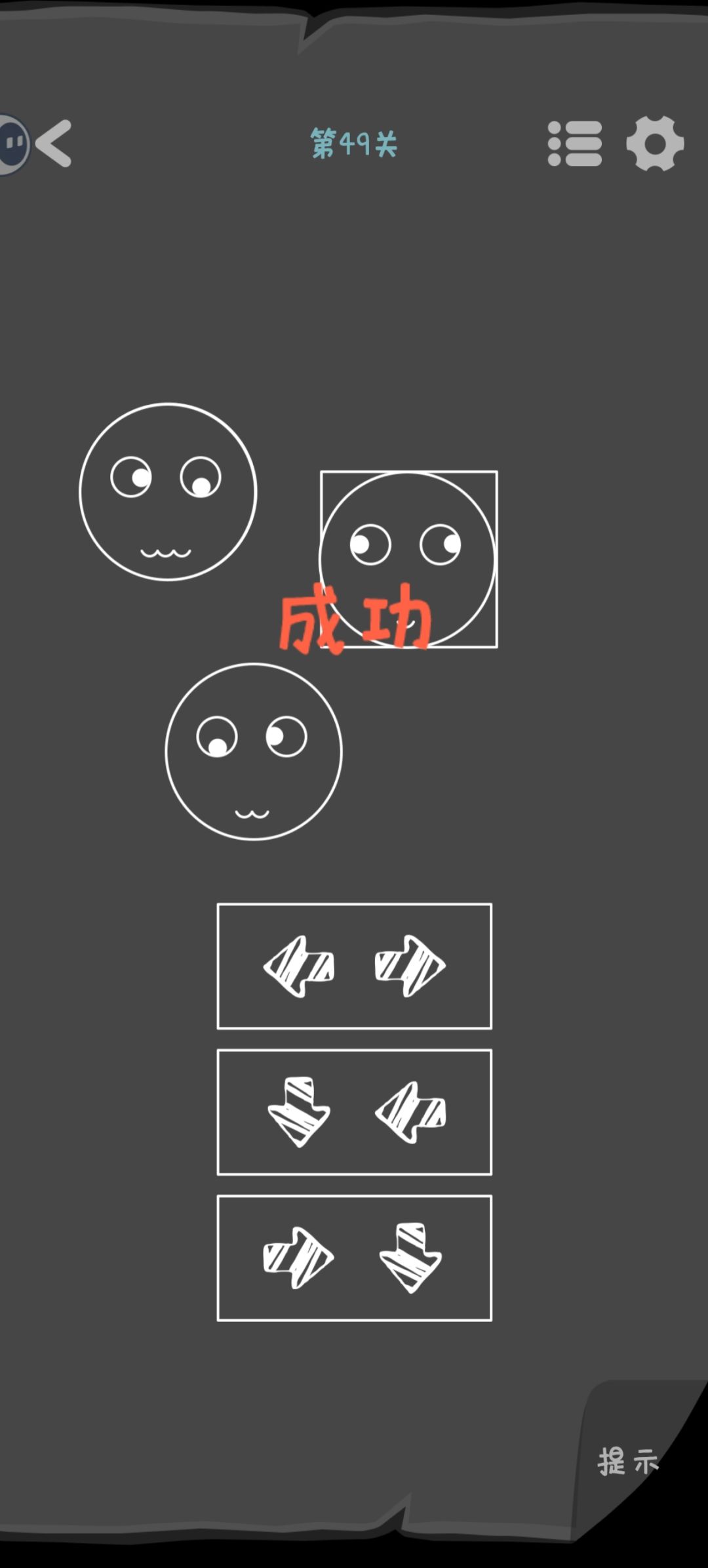 第49关 首先把圆形和方形都放到人脸下面,根据眼珠子的方向得到密码。这里要注意顺序,嘴巴有几条小波浪就表示是第几行的密码。