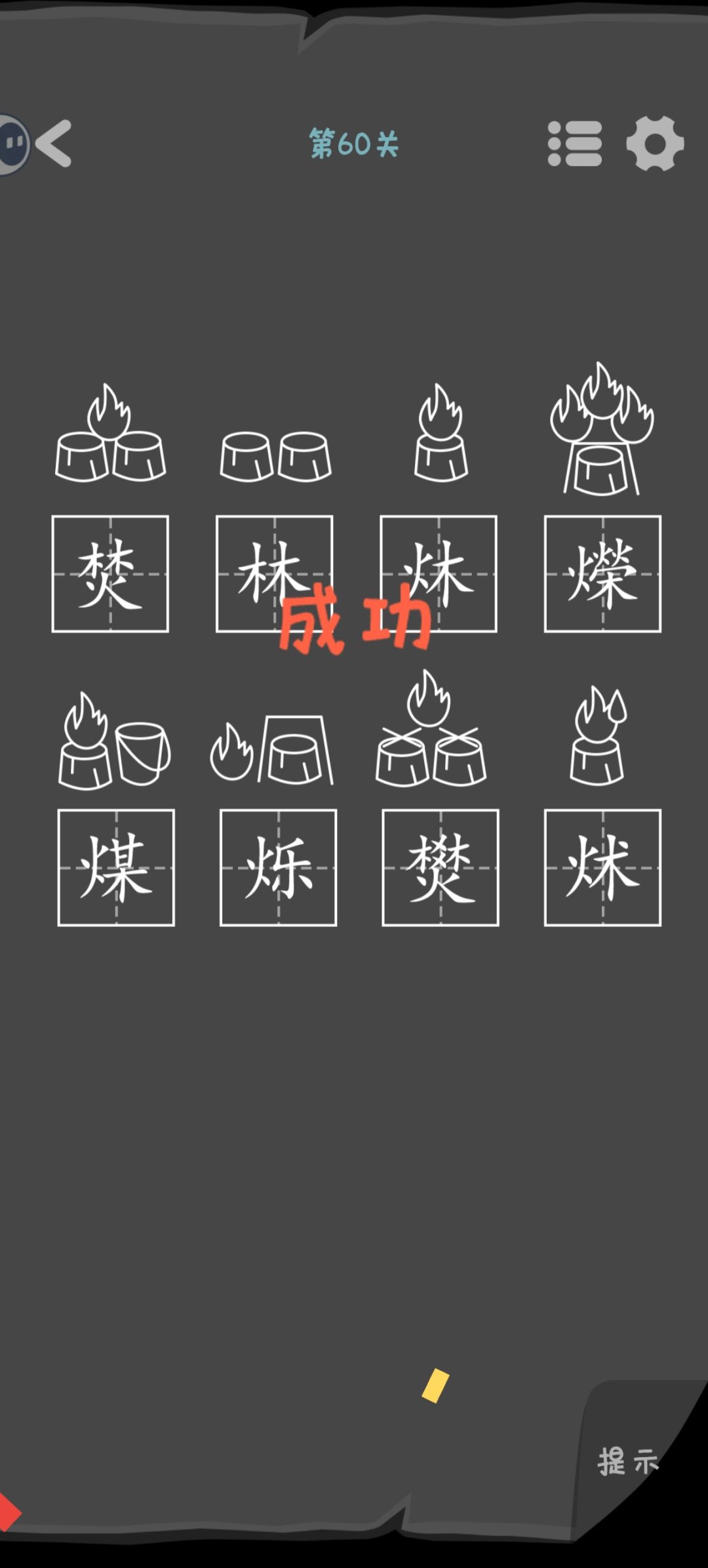 第60关 观察图标选择对应的汉字。比如第一个图标是两个木+一个火,就找哪个汉字包含这部分。