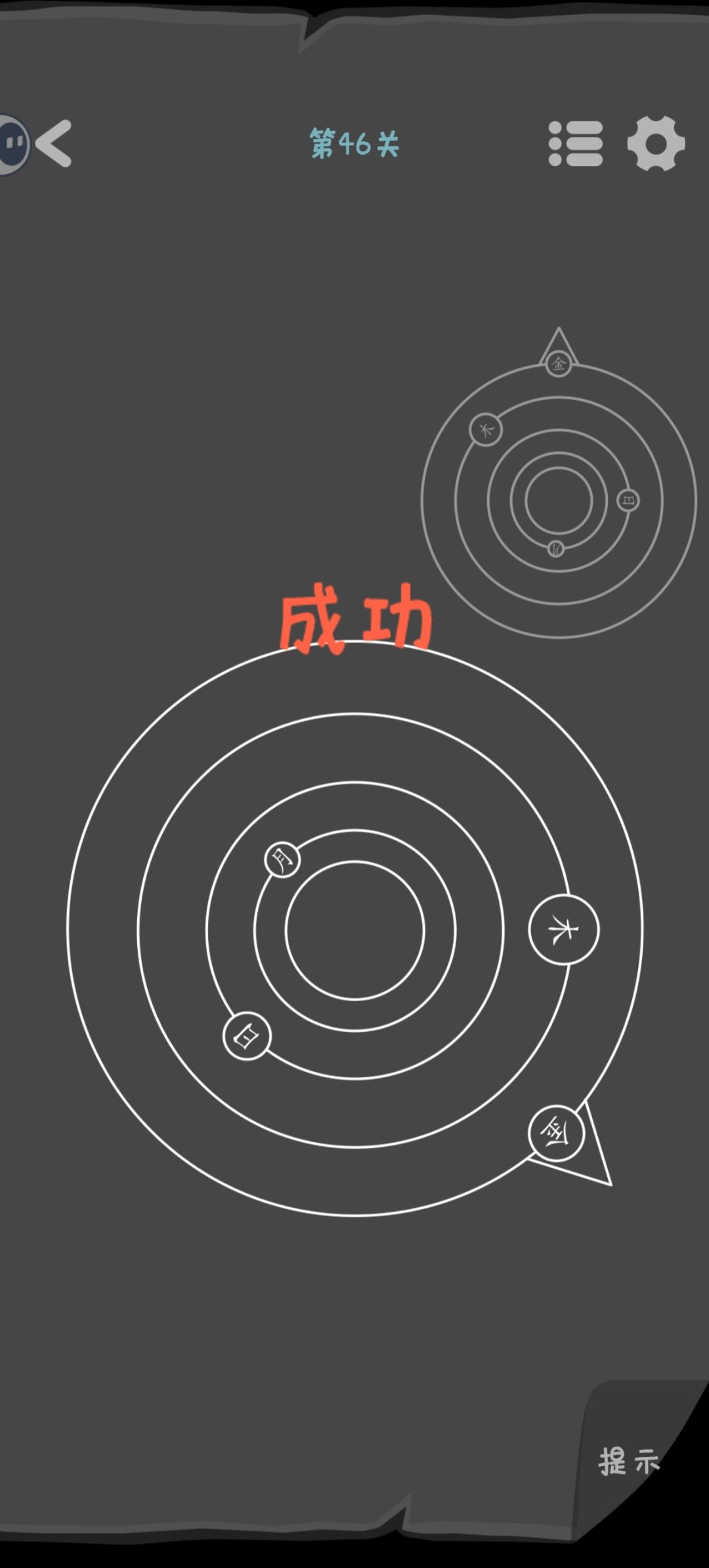 第46关 白给。把“金”放在尖尖的位置上,其他调整到和右上角图片一样的相对位置上就可以了。