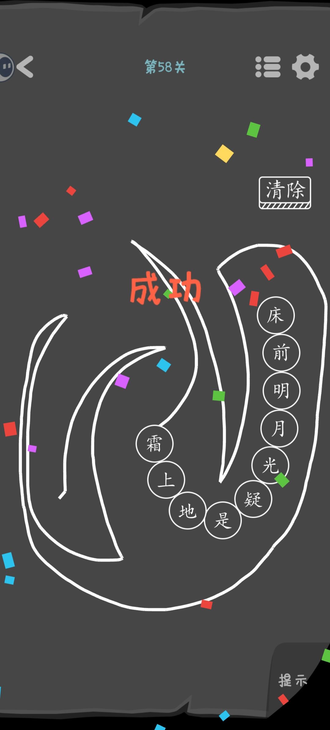 第58关 把古诗按顺序连线。这里注意前面连线时不要碰到其他未连线的文字,他是像贪吃蛇一样一个一个串起来的。当然,到后面其他文字都已经“被吃”后,线是可以交叉过去的。