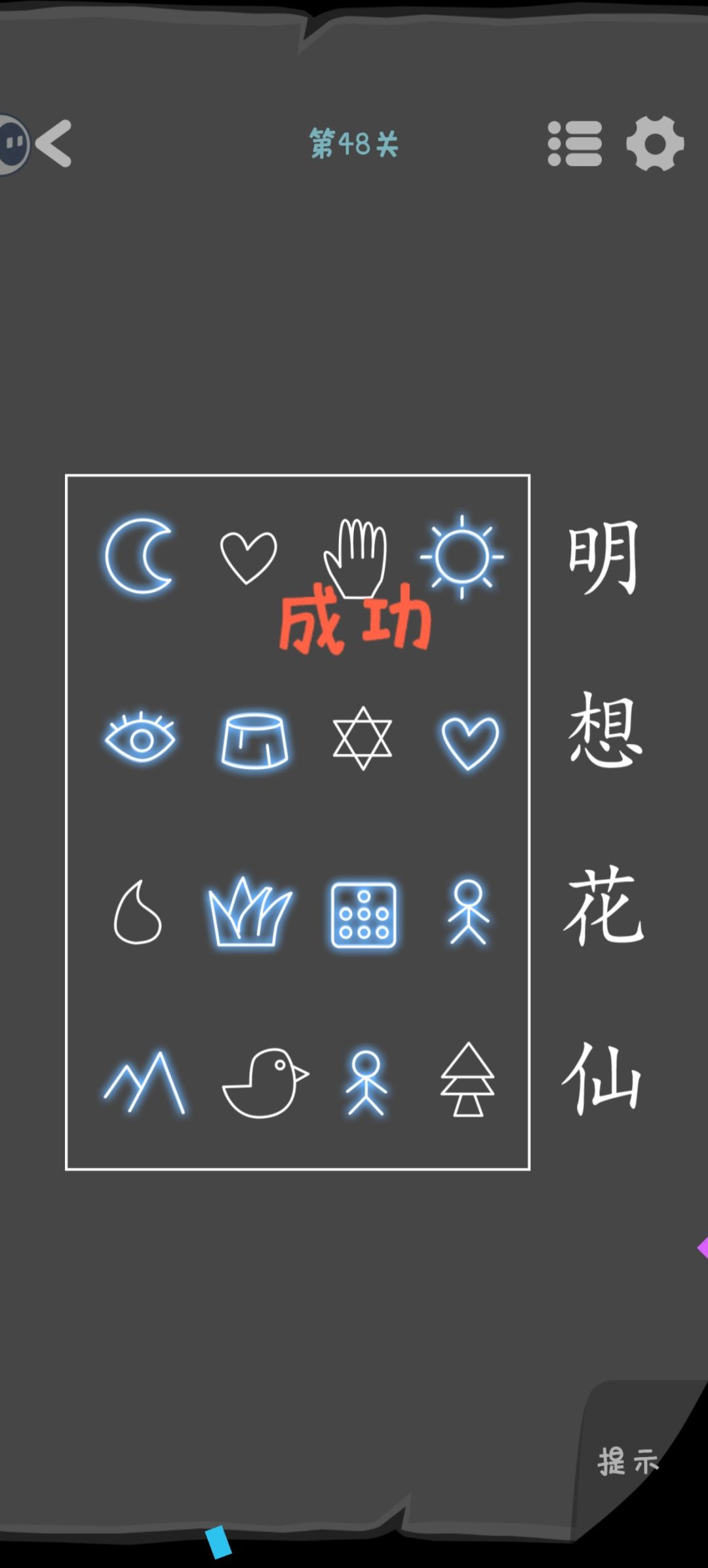 第48关 点亮汉字里面含有的全部元素的图标。比如“花”包括“草、人、七”。