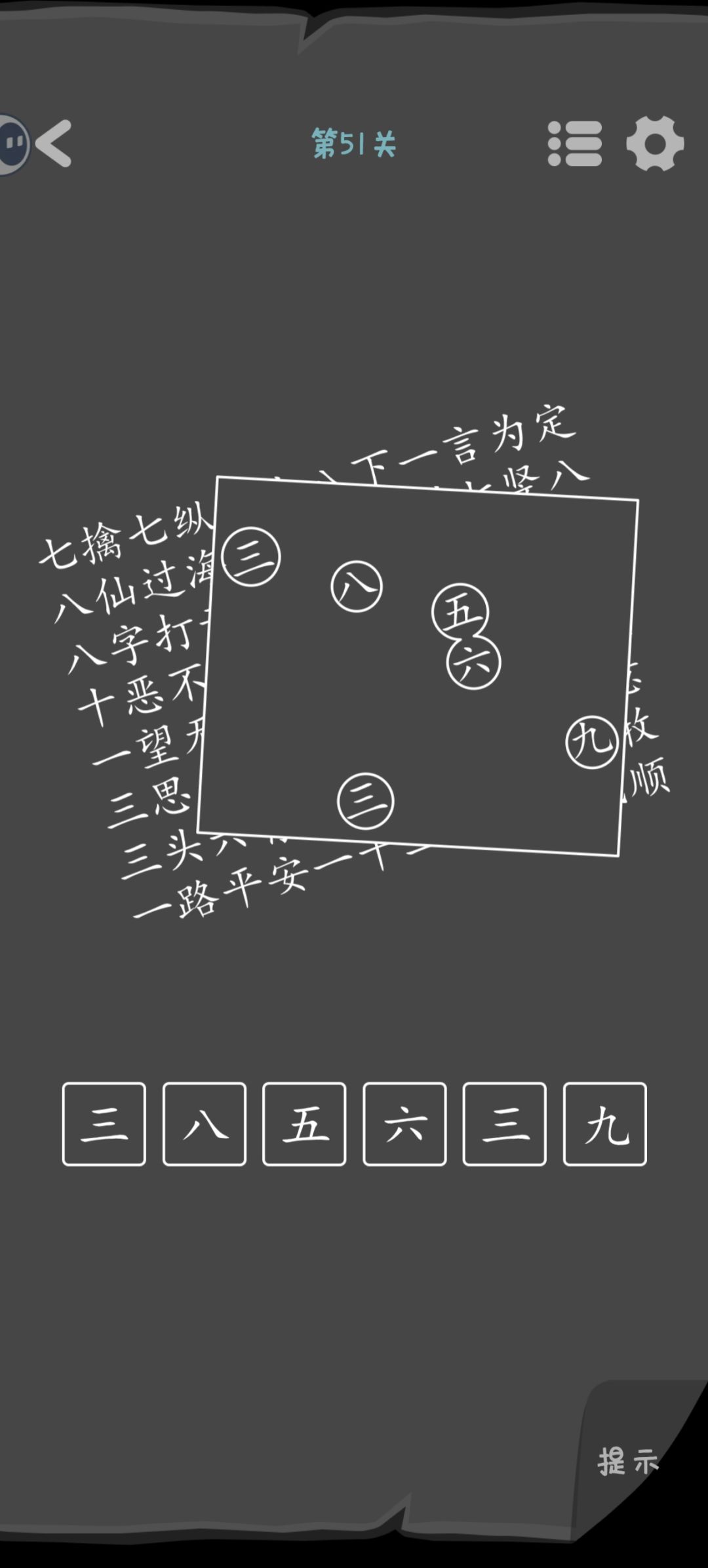 第51关 把纸板放进成语中,能找到唯一镂空处都是数字的位置。然后按照文字的正向视角(斜着看),从上到下,从左到右依次输入密码。