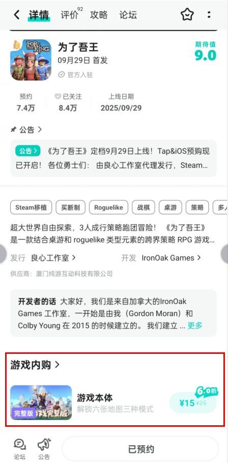 游戏现已App Store&TapTap开启先行预购,现可15元折扣价(原价25元)抢先预购!TapTap渠道可点击游戏详情页,游戏内购处前往购买。
