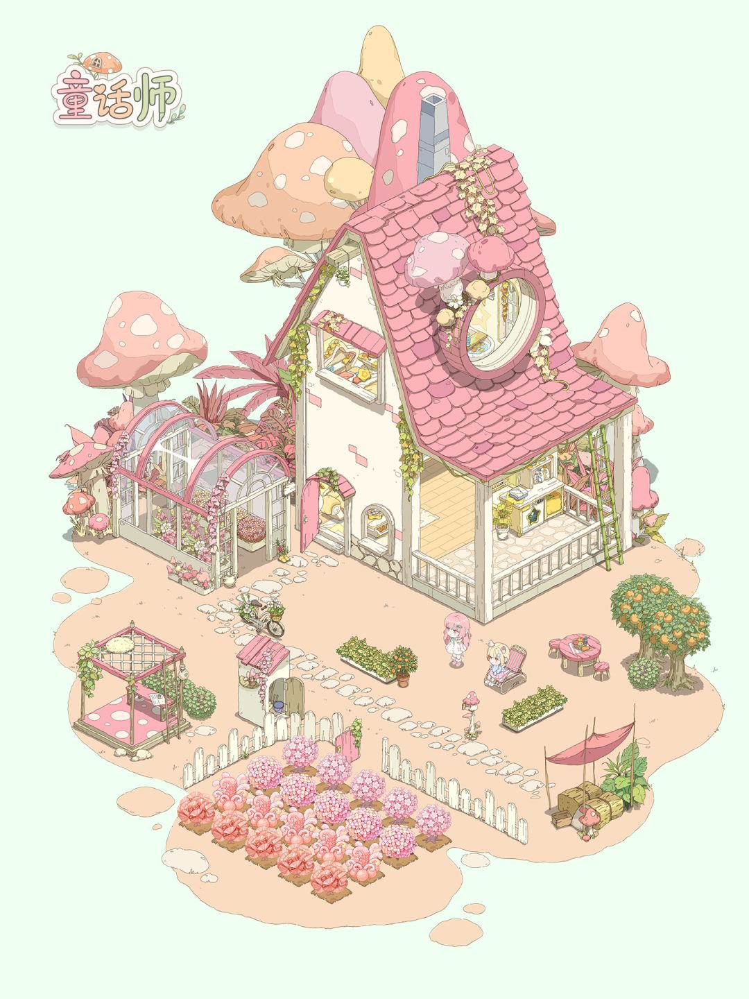 没有“初始户型就随便画画”的想法,它应该要布局合理,该有的东西一应俱全,整齐的花田、玻璃花房、休闲亭子、瓦片小屋、精致家具、氛围装饰……
