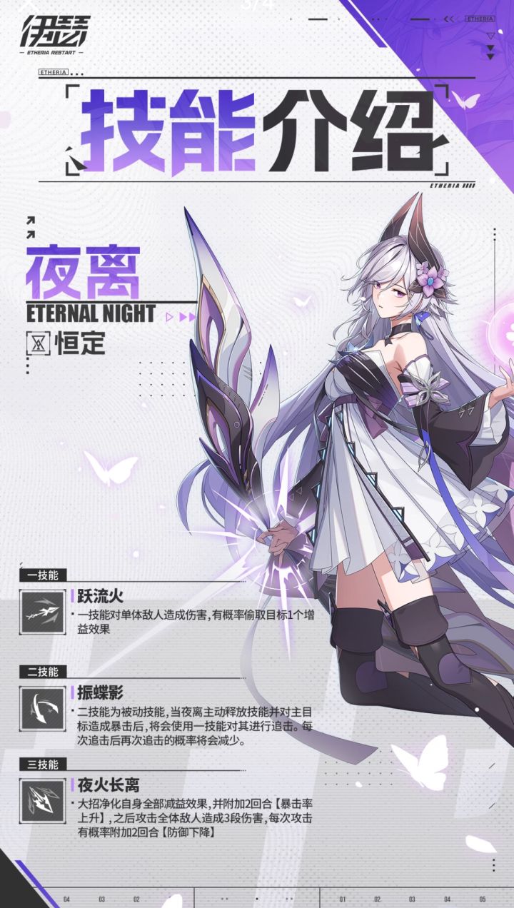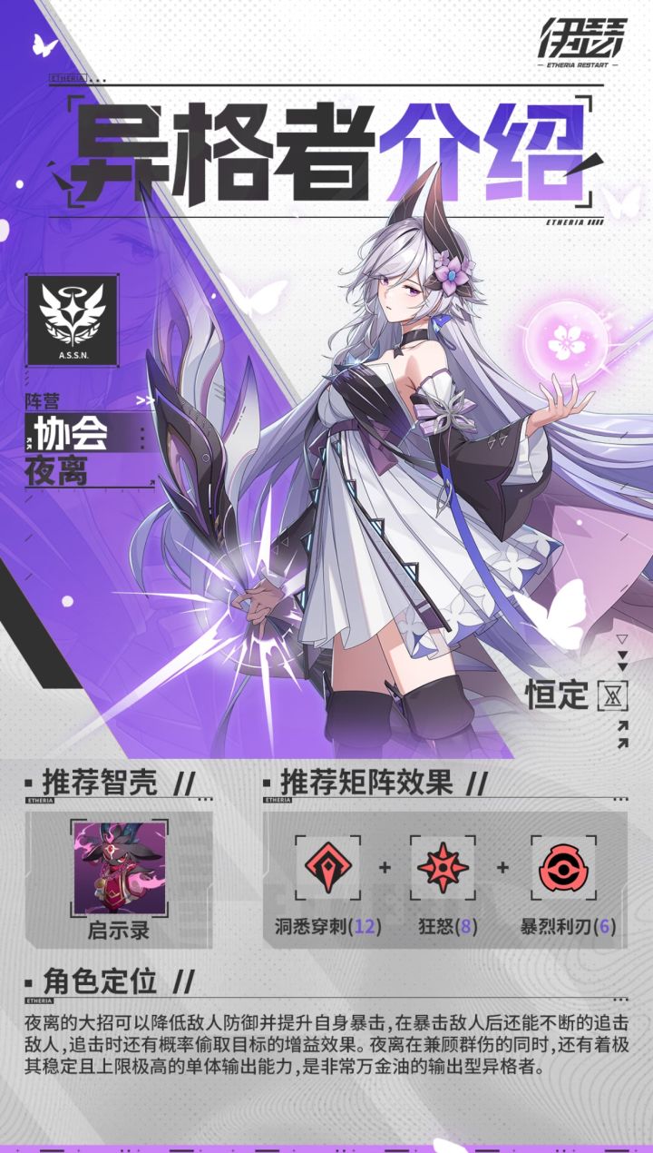 夜离,像宝石一样闪闪发光的美少女,“完美”的代名词,来自《伊瑟》超链协会蜃都分会。战斗中化身“蝶火掌控者”,箭矢所指皆是暴击禁区!💖