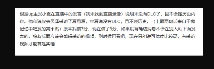 其说法具备一定可信度:张小夏今年5月曾与制作人夏思源合影,且贴吧玩家透露,他在近期直播中提及,曾联合UP主 @狼叔说游戏采访夏思源,对方明确表示无DLC计划,并强调创作将 “不碰历史”。而 @狼叔说游戏此前发布过该作开发幕后终极揭秘视频,与开发团队联系紧密。