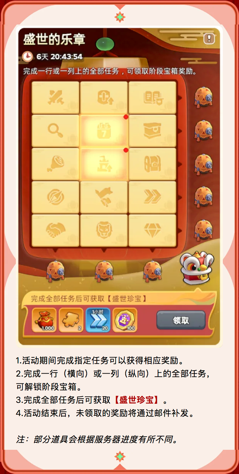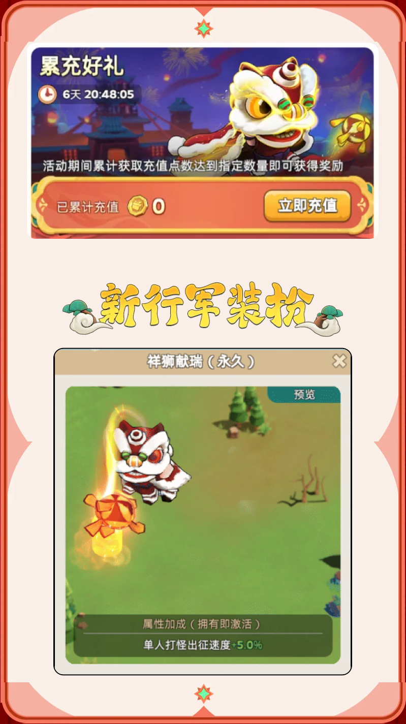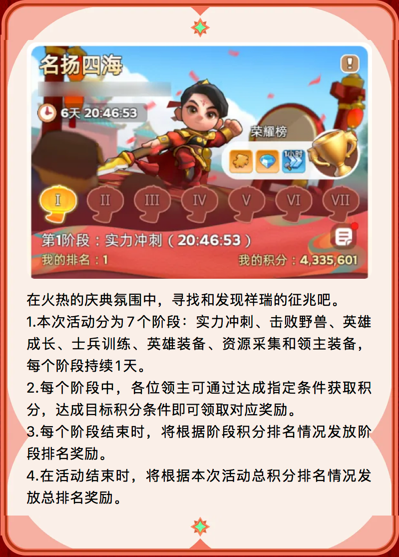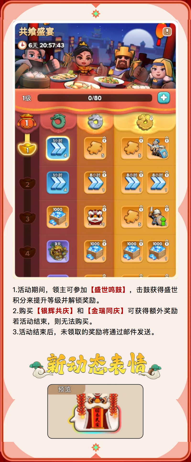 亲爱的领主: 盛世庆典,华章启慕,值此九州同喜之日,我们诚邀各位领主一同共迎国庆佳节! *盛世庆典活动将于2025/9/29 00:00:00~2025/10/6 23:59:59(北京时间)于符合条件的王国开放,更多内容详见游戏内活动规则。 *盛世庆典活动开启需城镇中心达到6级。 *更多详情请前往活动规则查看。 杰贝尔这里给看完的领主送给小兑换码,国庆当天还有节日兑换码哦~ 🔑 兑换码:BBWG0929 ⏰ 有效期至:2025年9月30日 23:59:59 ✨ 兑换要求:城镇中心等级 ≥ 9级 兑换中心:https://giftcode.benbenwangguo.cn/ 注:部分活动和功能首次开启需服务器满足条件,并非全部服务器同时开启。部分道具会根据服务器进度有所不同。#奔奔王国 #