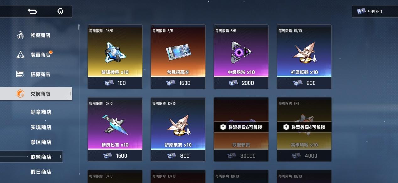 联盟商店是重要资源补充地,花费联盟币可购买到破译棱镜、招募券、场粒、纸鹤等上架商品。联盟等级越高,上架的商品数量越多。此外,每周日10点,联盟拍卖开启,所有联盟成员可参与竞拍,周贡献≥1000的联盟成员,可获得本周的拍卖分红!