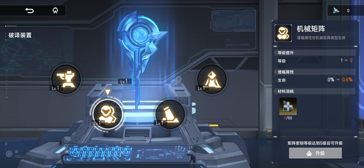 破译能够增益矩阵的属性,让矩阵具备更好的输出效果。指挥官通过消耗【破译棱镜】即可提升各破译装置的等级,需要注意的是,矩阵密钥升级到5级后,才能升级火力矩阵、机械矩阵、轰击矩阵、源能矩阵的破译装置等级。