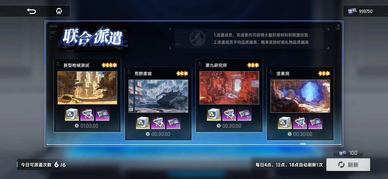 每天可派遣成员完成6次各星级的派遣任务,完成任务后,可获得拟境锚点、材料包、联盟个人贡献、联盟经验等奖励,并且派遣成员的平均品质越高,获得高品质好感礼品的概率也越高。当派遣任务星级较低时,指挥官可花费100联盟币刷新当前的派遣任务。