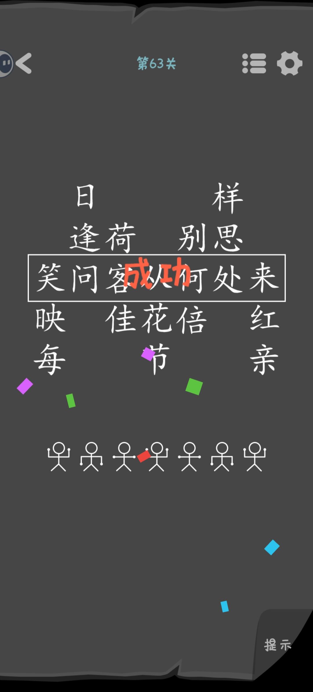 第63关 根据小人的手势选择第几行的文字。手势朝上就是第一个,手势平举就是第二个,手势朝下就是第三个。最后组成“笑问客从何处来”。