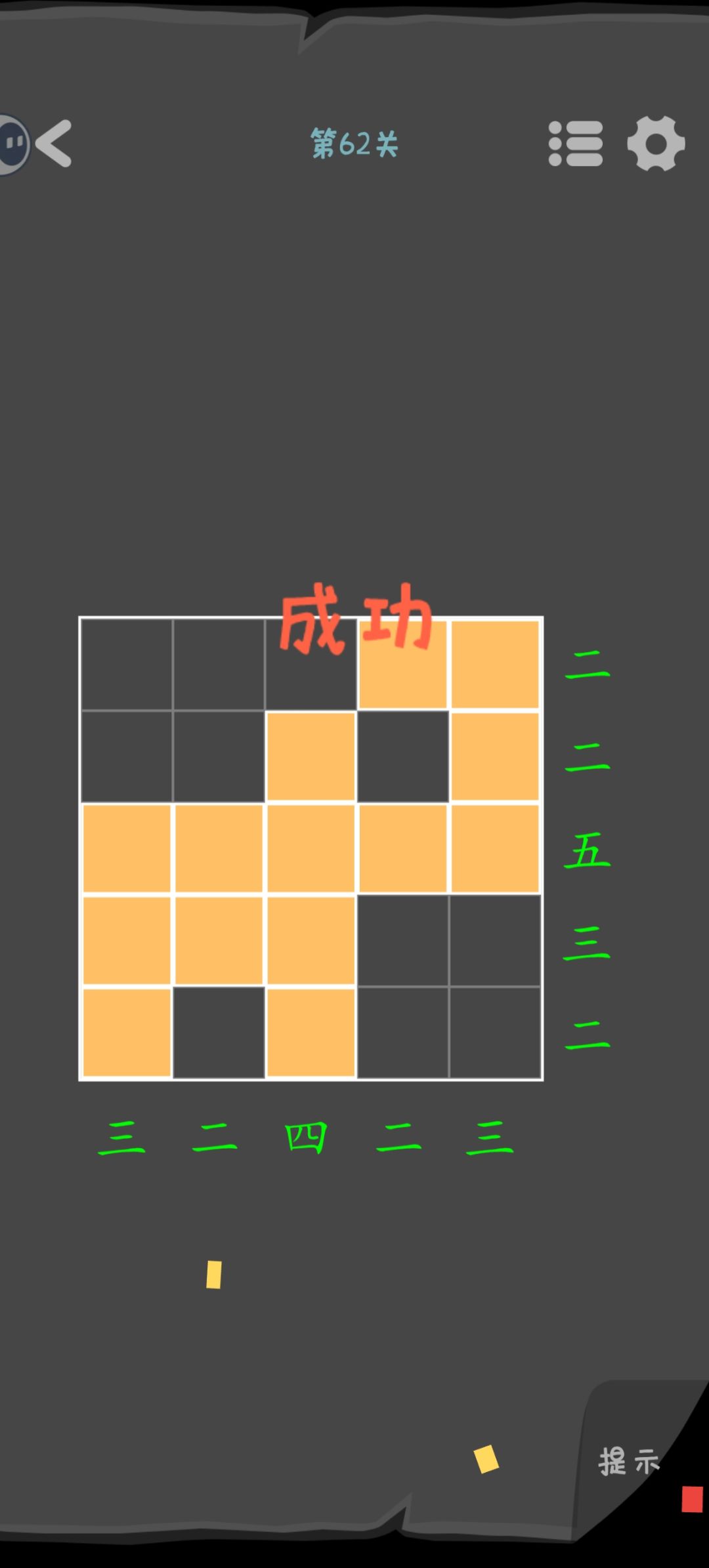 第62关 移动黄色格子满足每行每列的个数。答案不唯一,可以先把“五”那一行的凑好,剩下就微调一下满足每列的数字就可以啦~