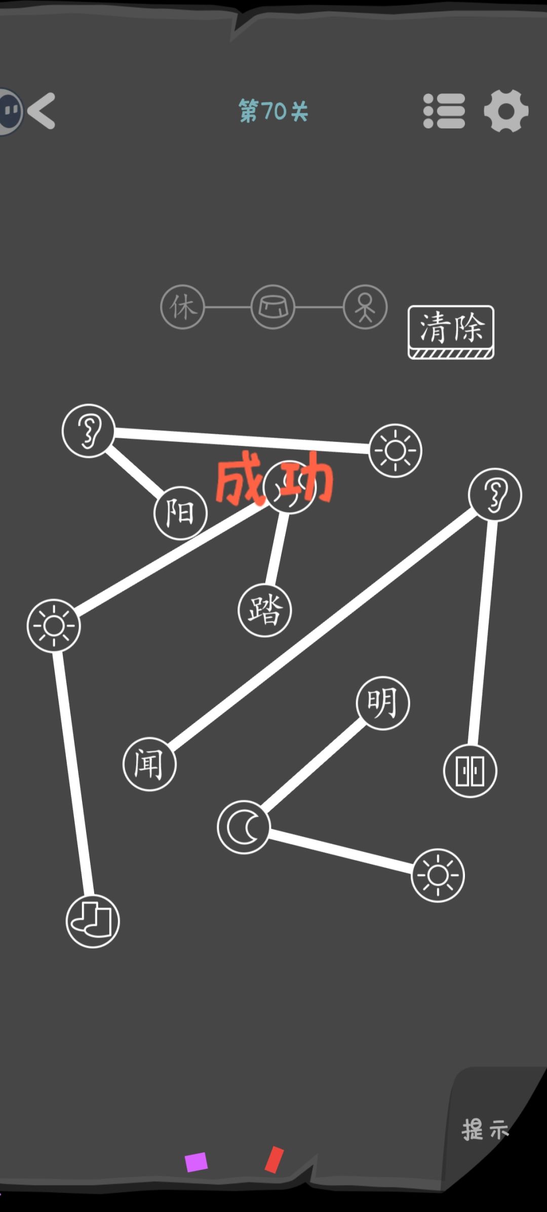 第70关 把汉字和其所包含的所有元素图标连在一起。连成一条线即可,不用连成封闭三角形。这里需要规划一下,连线不能交叉(不能出现红线)。