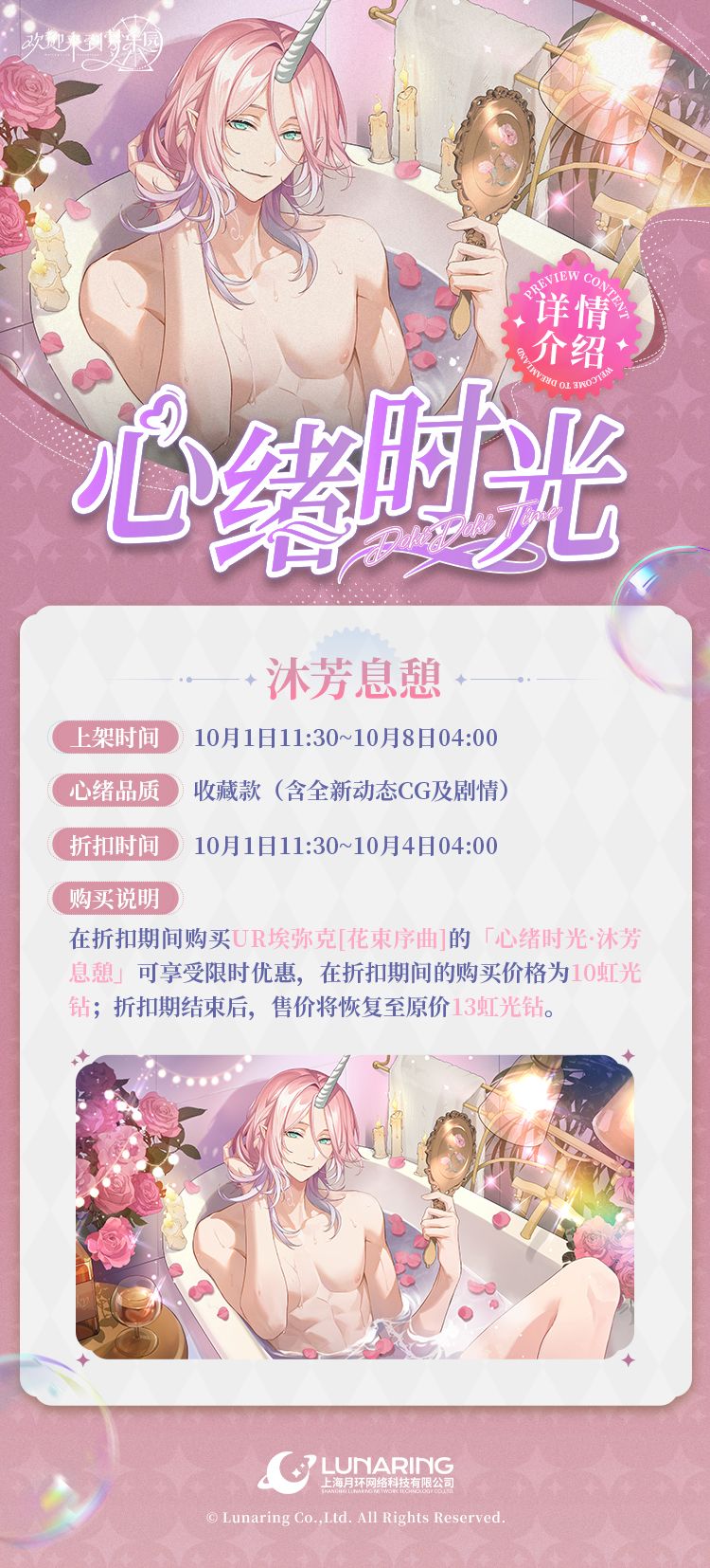 - 售价:在折扣期间购买「心绪时光·沐芳息憩」可享受限时优惠,在折扣期间的购买价格为10虹光钻,折扣期结束后,售价将恢复至原价13虹光钻。