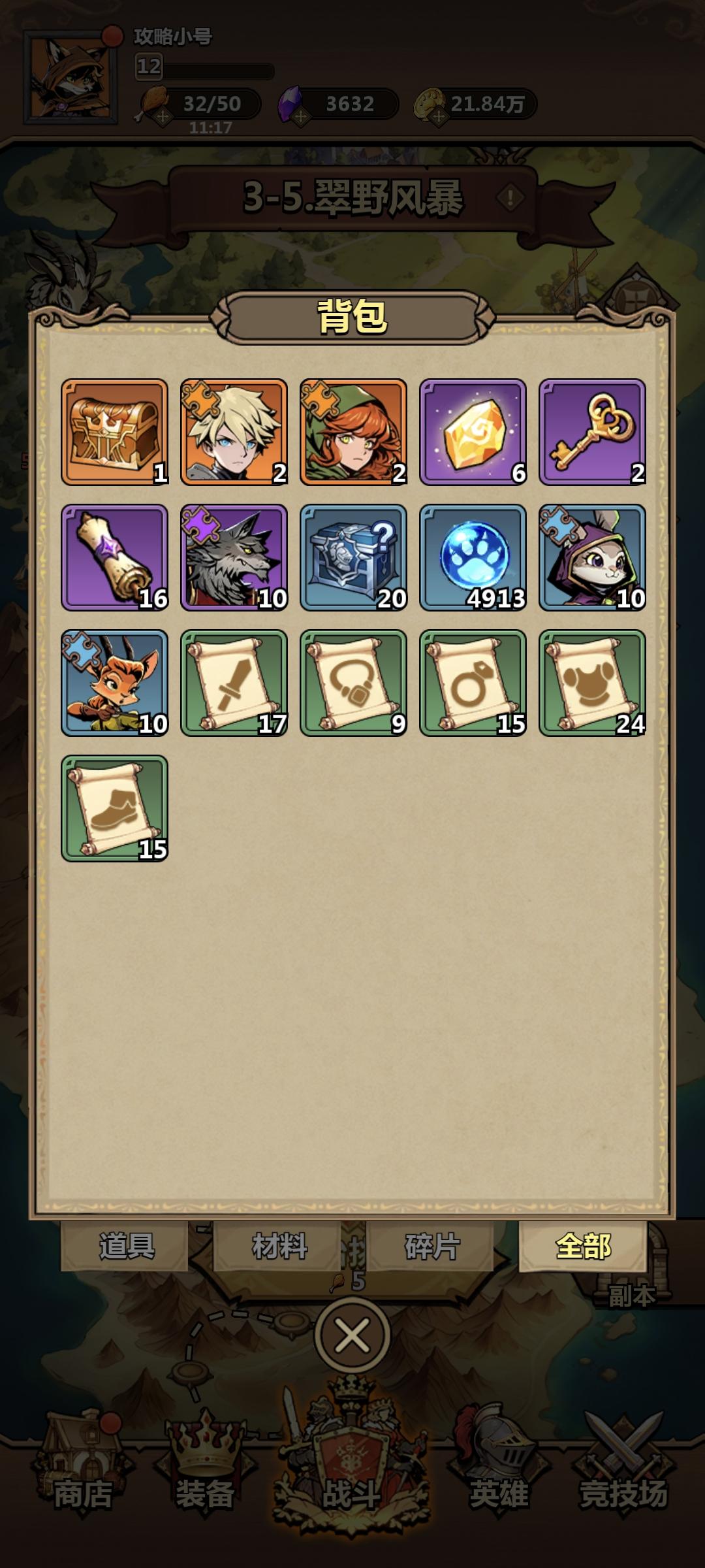 第四天,国庆加更新了征召试炼,加集市购买的招募卷,不解释70抽。出了一个红光鹿,笑死了。另外装备血量加强了。体力系统也更新了,可以刷开局,你对战后才消耗体力,开局不好直接退不消耗体力。征召给了很多银钥匙,爽抽。升到20级开始讨伐第五章。因可刷开局,就不截图了。下面只记录每天打到哪里。另外竞技场也优化了,现在零氪建议每天买2次,氪三卡的建议拉满。