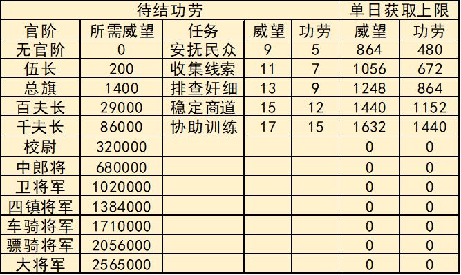 可以看到,随着威望(官阶)的成长,每日任务获取量是增加的,且总旗到百夫长/千夫长的功劳增加期望值高于前三个官阶(后续官阶的任务与收益目前未知,待后续更新)。