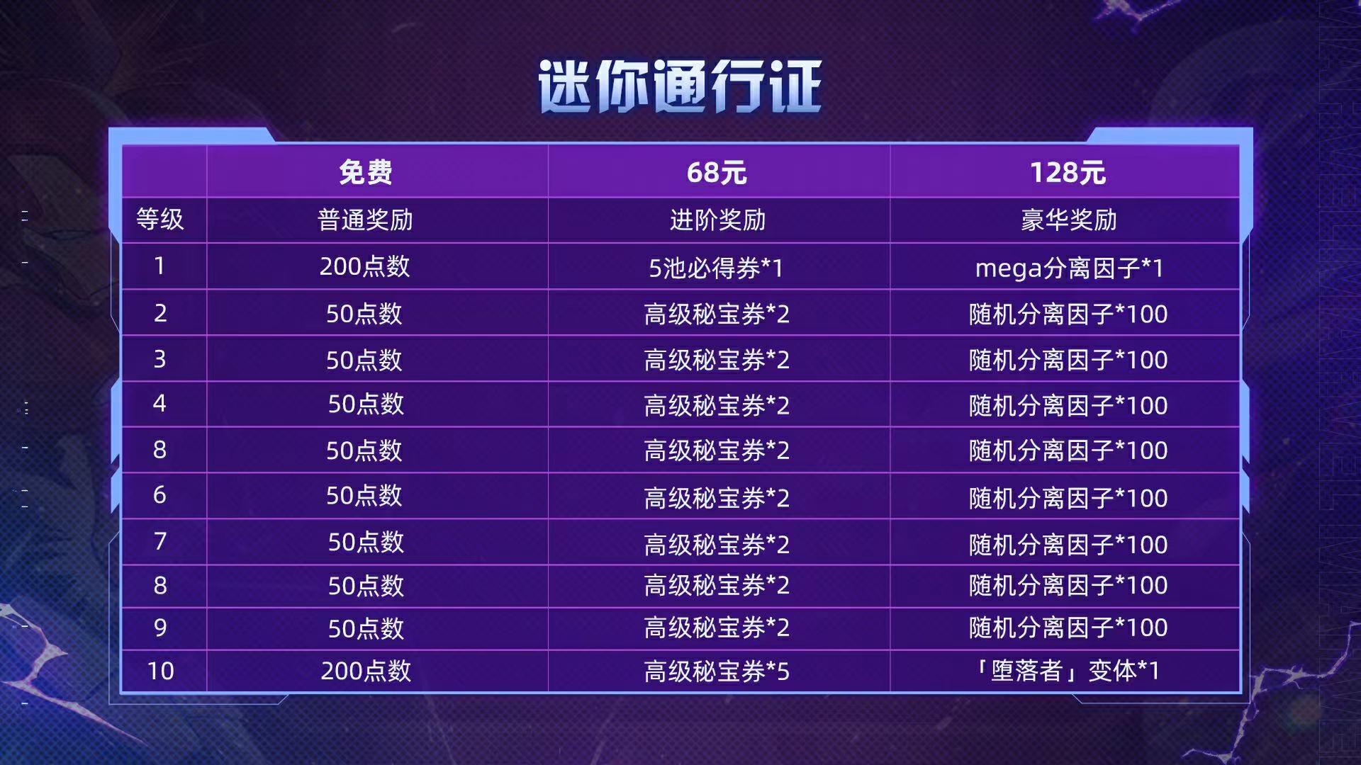 完成通行证任务提升通行证等级,解锁【星尘徽章】和【高级星空币】等奖励,若您选择购买通行证,更能解锁 Mega 分离因子、战场背景等专属奖励。