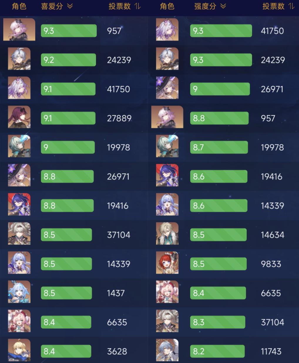 而说起角色强度分排名的话也来了,本期遐蝶、白厄以9.3的强度分并列第一,这两位也是当前版本T0顶级输出大C,强度数值极高。其中遐蝶更是因为长夜月登场,再次增强,白厄的新队友刻律德菈才刚刚up,3.6卡池下半还有另一位新队友丹恒·腾荒的登场,白厄战舰也会迎来补强,两大T0战舰简直不要太香。