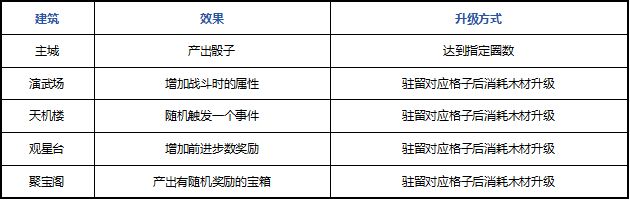 地图上存在5种可升级建筑,具有不同的效果,主公可根据需求选择性升级哦~