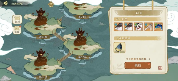 升级材料:通过 “山海秘境”(类似爬塔,每天最多挑战 30 层)获取,每天需领取免费宝箱补充材料。