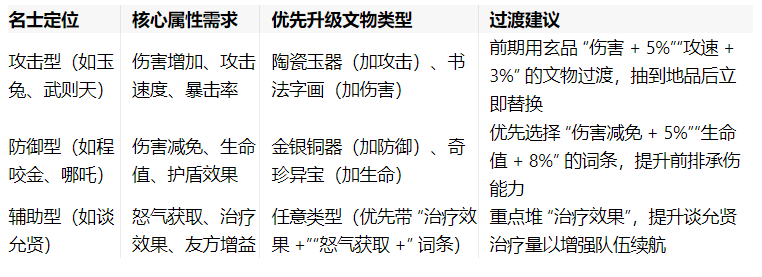 后期抽到 “毕业词条”(如攻击名士的 “伤害 + 15%”“攻速 + 10%”),优先升级该文物。