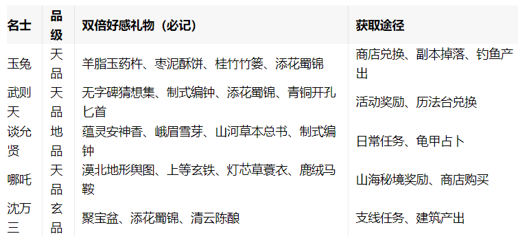 若缺少特定礼物,可赠送 “油纸伞”“宣纸” 等通用礼物(多数名士可获基础好感),但效率低于喜好礼物,仅作补充。