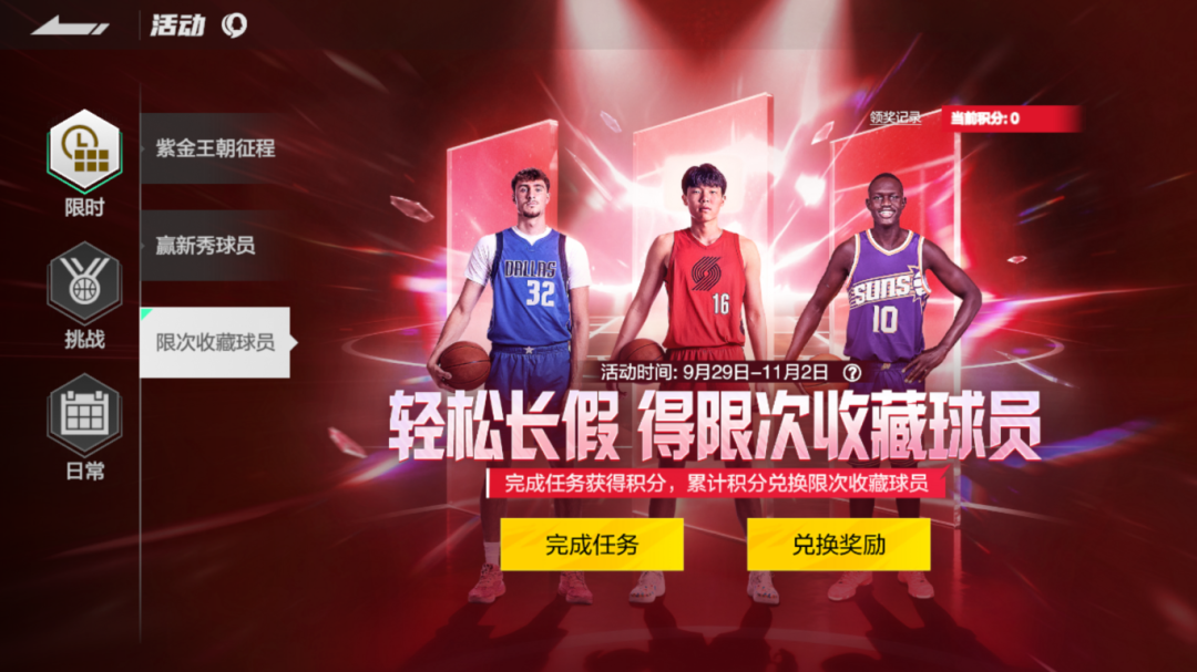 9月29日 11:00 - 11月2日 23:59,活动期间,完成任务获取积分,累计积分可兑换限次收藏球员(满突20级,限时3天使用3次)。