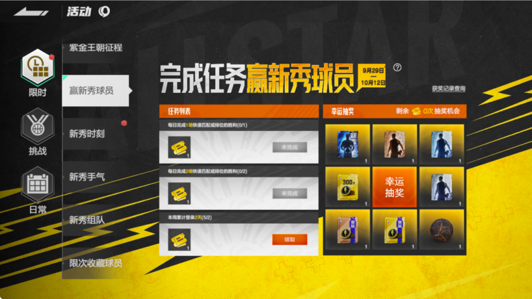 9月29日10:00 - 10月12日 23:59,活动期间完成指定任务,可累积幸运抽奖次数。抽奖有机会获得 25 年新秀球员包、S5赛季明星现役包、现役优选球员包等免费好礼