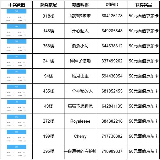 活动截至时有效楼层为2-454楼,经随机数抽取获取获奖楼层和名单如下: