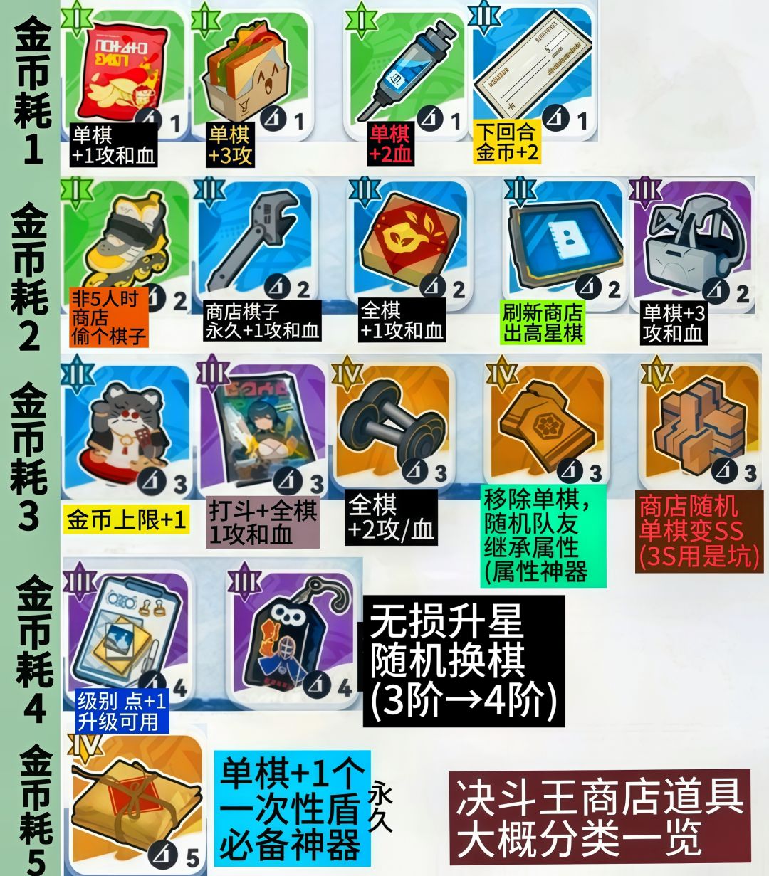 道具分类按消耗金币来整,不涉及具体分类效果。