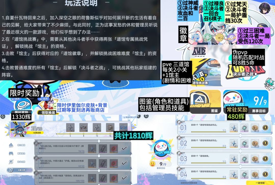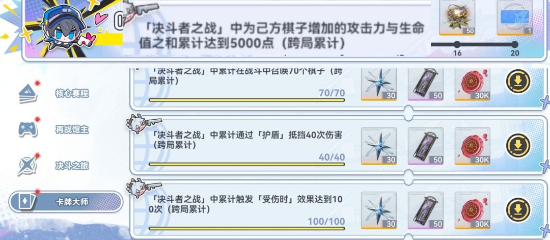 想拿完奖励这俩种都需要参加,其中三馆主关因为有无限重开+金币保底机制,一般没问题。决斗者之战,要费点时间(非连续6胜、积分1万、累计受伤100、累计战斗唤棋子70个、累计护盾消耗40次、累计已方增益攻血之和5千)。