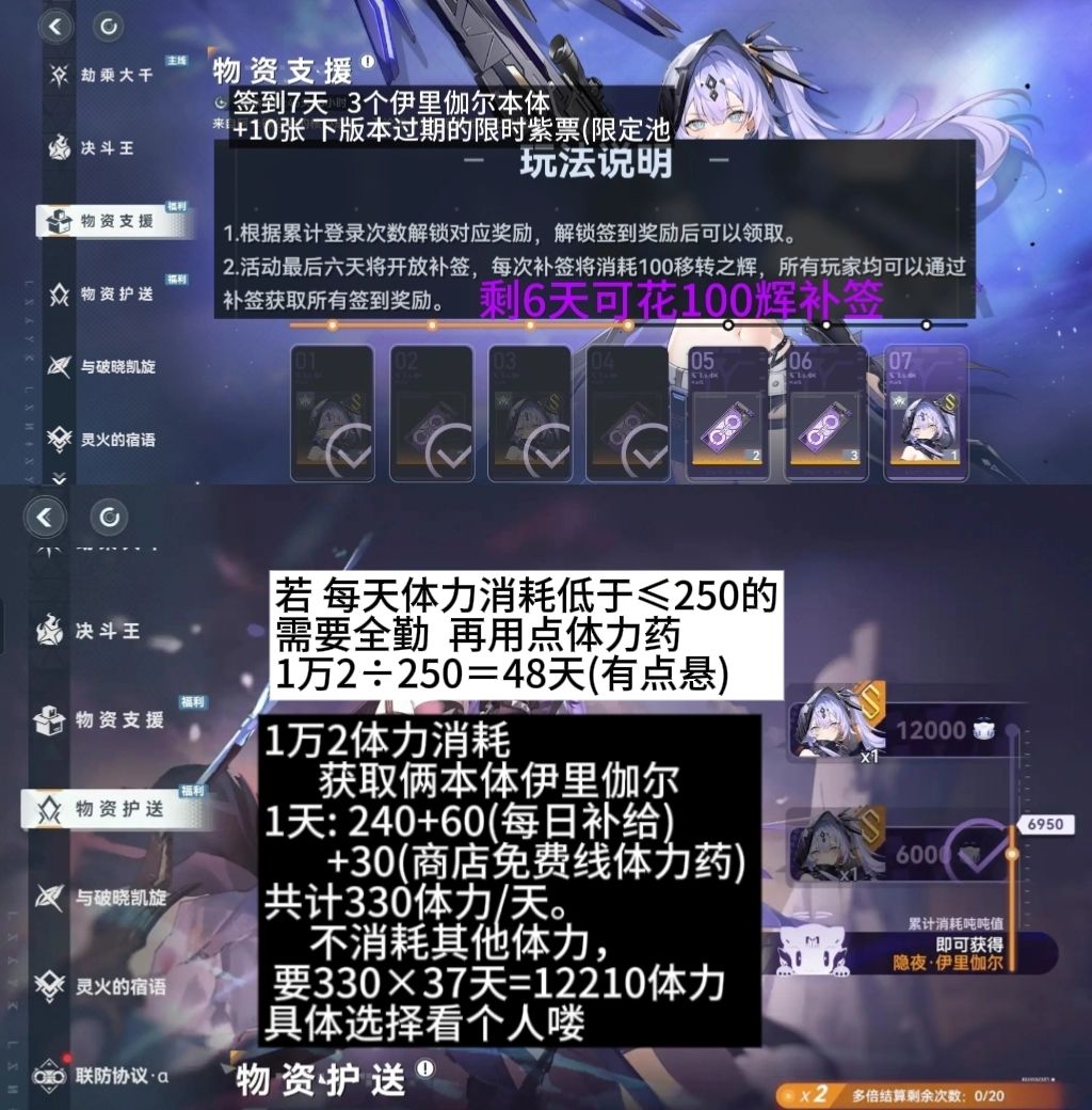 本次双角色,肝1万2体力和签到获取。版本期间内每天330一般够了。全勤37天满1万2。若是一天纯消耗低于330的,那就需要使用体力药了。除了氪金外,部分网页活动签到也给点体力,再有就是版本密令了。