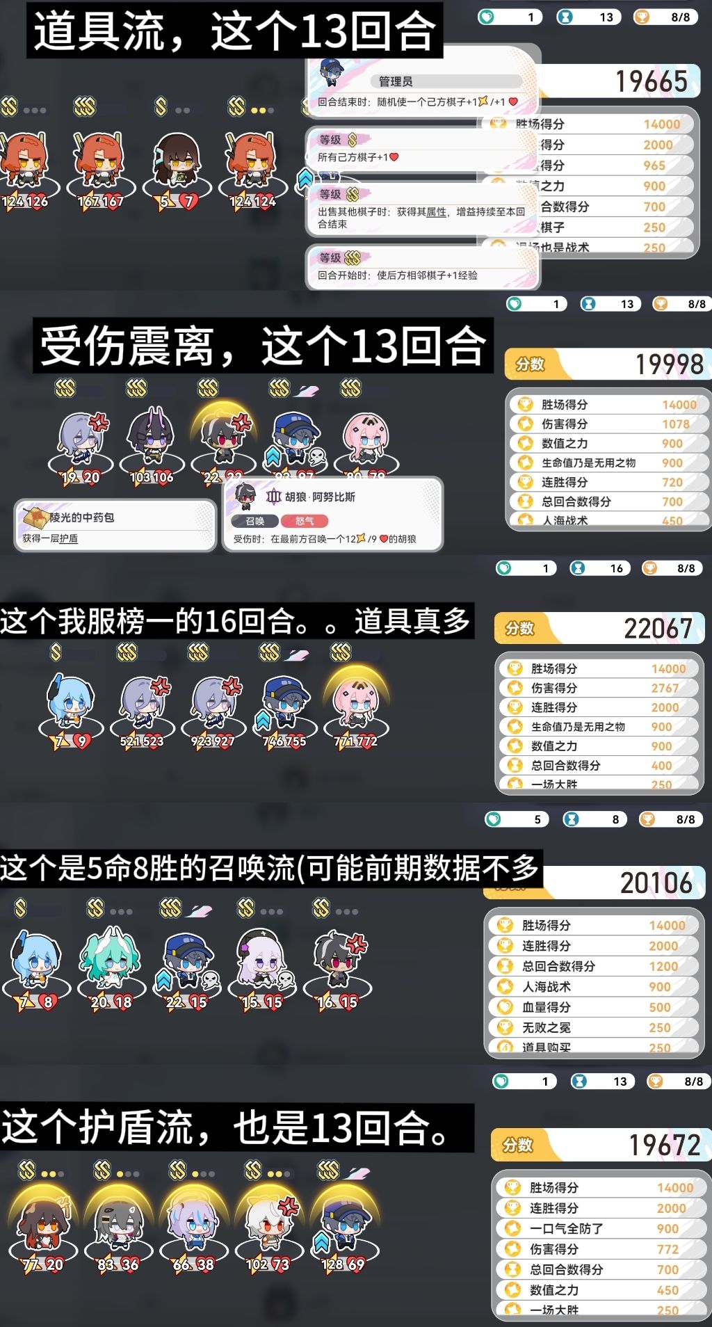 开头说了,不刷分,多进行游玩。几种流派慢慢堆就行了。对局中,没事就给管理员用道具,有事给流派大哥加属性,非流派不用加。当然还是看随机哪种。