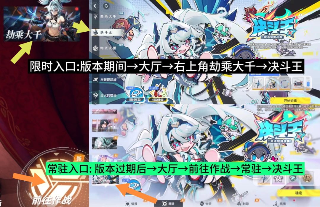 - ①限时入口:版本持续期间,大厅右上角劫乘大千活动图标→决斗王→进行游玩