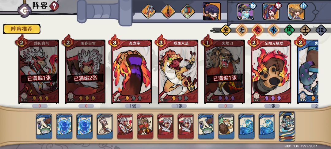 开局用火炎刀,纯阳真气,幽焰魔音快速上灼烧,易伤,阳春白雪未叠够四张时秋水柔劲和浪涛势等卡牌先不打出,防止天元棋圣武学转牌时数量不够直接卡住。阳春白雪叠够四张后便可挂火,打出弱水三千,抽牌触发洗牌,天元棋圣转牌,以此循环。