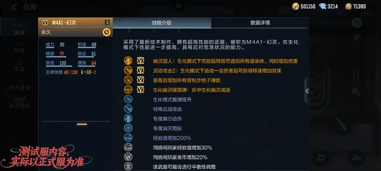 幻灵系列武器最吸引CFer的无疑是它的主武器“M4A1-幻灵”了,这款武器是一把典型的“竞技、生化”双开花的武器,在生化模式中不但拥有高贵的减速能力,还拥有透视生化幽灵位置的技能,更强势的是在造成一定伤害后还会提高自身的移动速度,这样的技能搭配使得在生化模式中能够让生化幽灵无所遁形。