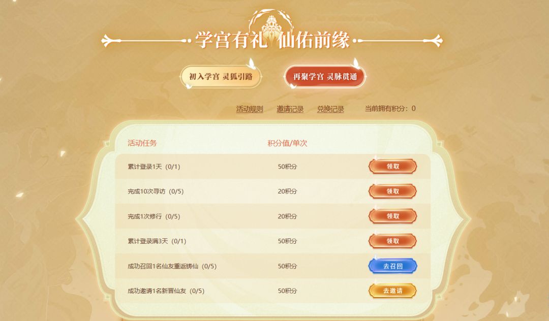 活动开启前注册的御境大人,通过寻访、召回老友、邀请新仙友等任务兑换积分,累计积分可以兑赤炼火羽、幽梦翎羽等丰厚好礼。