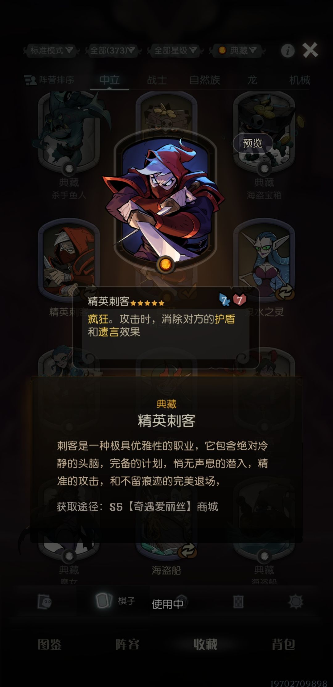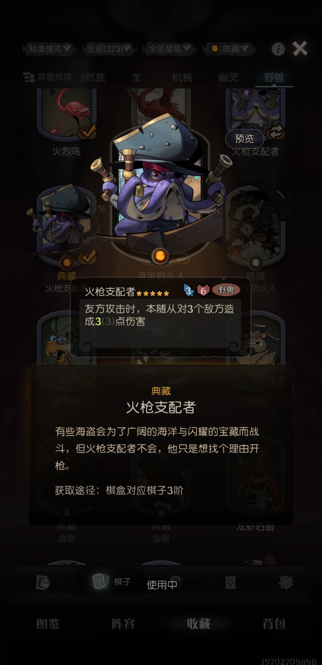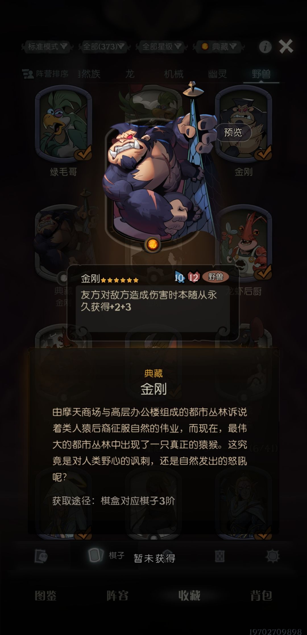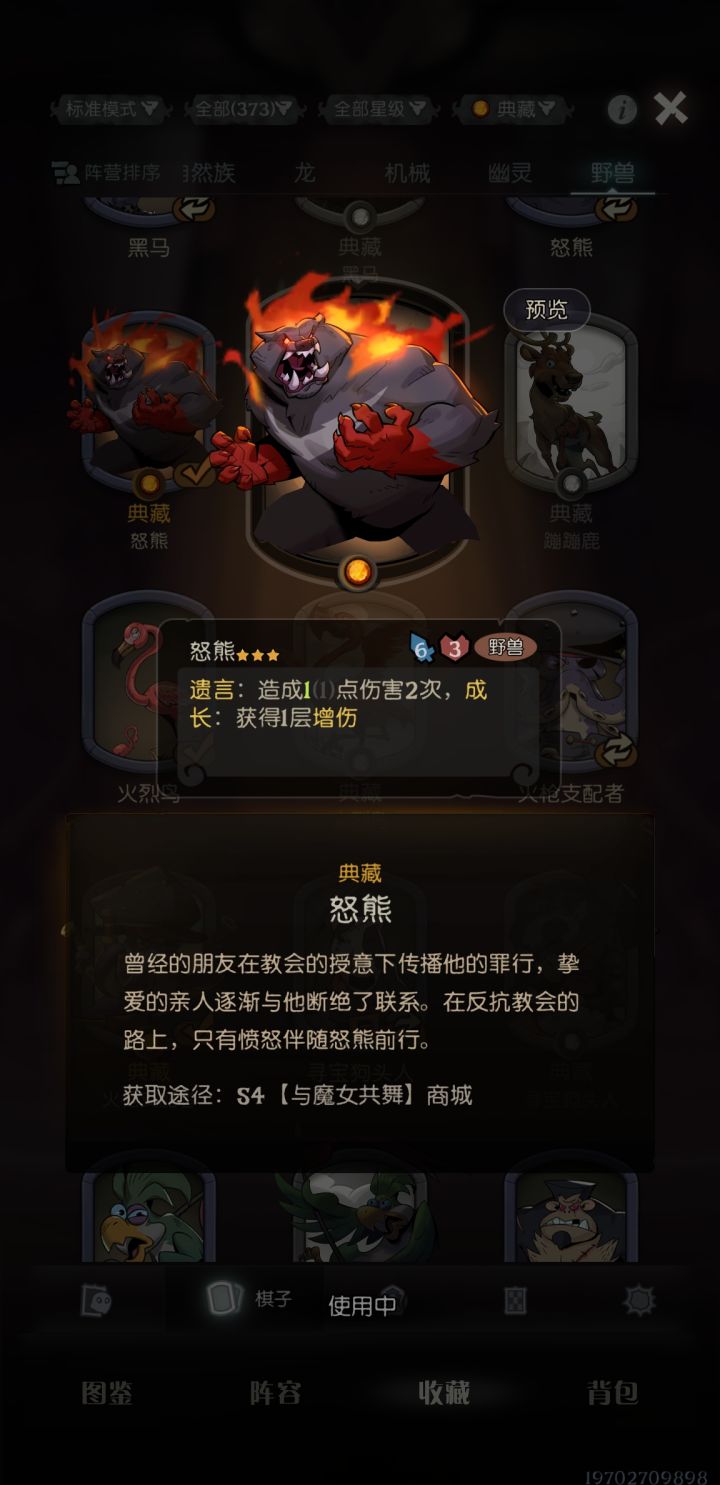 野兽局,特效很帅,卡面很帅,但是不常用……金刚这种战力卡,自然自伤玩的少了,野兽也改玩蜕变了,叠不起来,前期拿到是压力牌,后期除非恰烂分,阵容没成型,不然我一般不玩。棋盒专属,很喜欢但不会兑换。