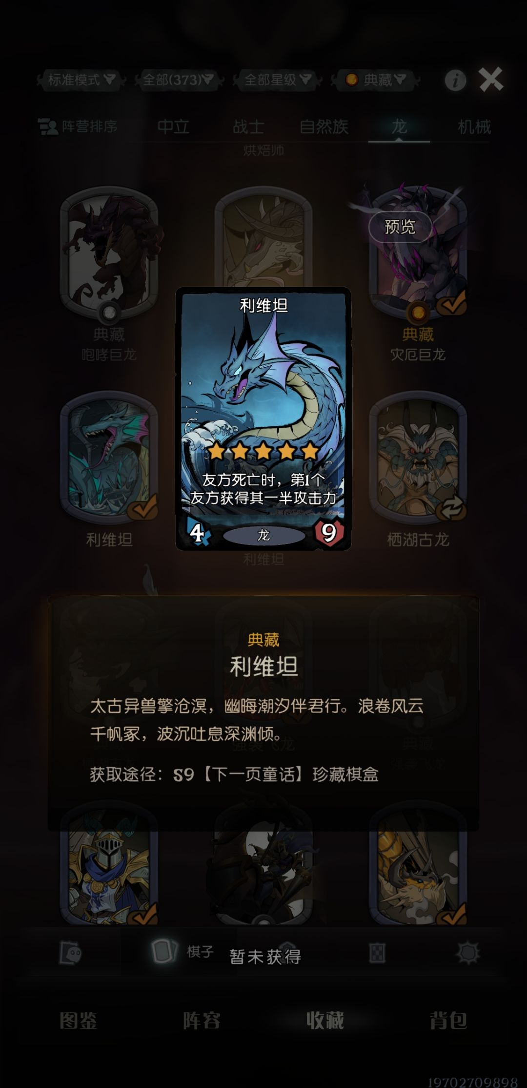 龙族新的核心,基本上现在多龙族各体系里,利维坦都可一用,作为新出的典藏卡,设计上和局内特效都挺好看,但是利维坦本身就多适配龙族,加上其白板的特效和卡面都还不错,所以见仁见智。棋盒专属,我应该在玫瑰到位之后开始换利维坦。
