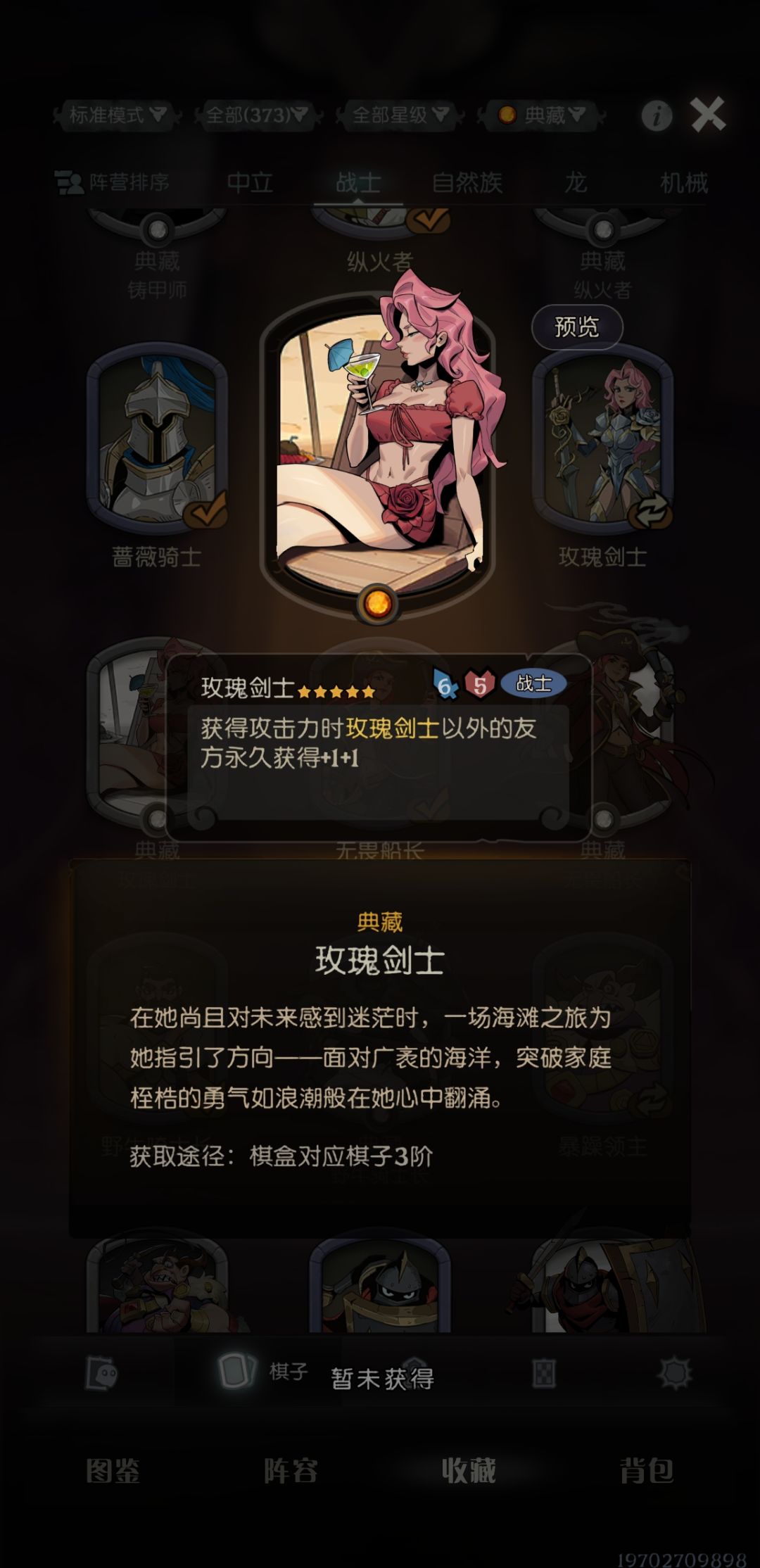 )。战士局常用,而且看样子策划的态势对战士种族的规划后续也是多次属性提升+装备+护盾三种流派。玫瑰作为一张通用卡感觉还是比较保值的,卡面也还可以,有专属局内特效。棋盒专属,感觉应该不亏。——