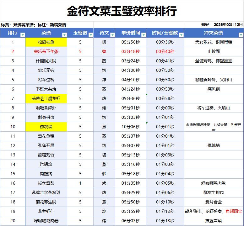 2月11日更新:鱼翅四宝作为五火菜,耗材也不友好,居然是3玉璧,排名35,不在图里展示了,差评;马踏飞燕是1玉璧,正常,看来不像传闻中符文菜有首发buff,即使是1玉璧也是很强的符文菜和金币菜。美乐蒂下午茶被砍成3玉璧,前5名菜谱已经测了暂时还没被削。