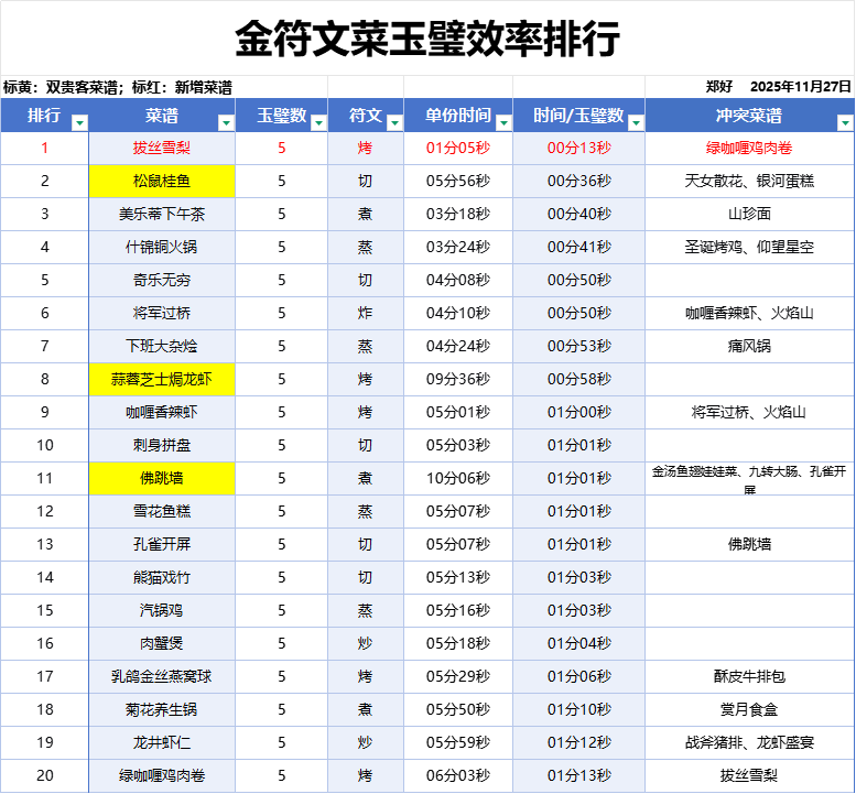 效率排名跟5火菜相比根据玩家贵客队的贵客率决定(不在表格体现),用传统贵客队这道菜排20以后,用裘小白队能排到前5,金币效率也不低,适合用刺客队刷同时赚点金币。