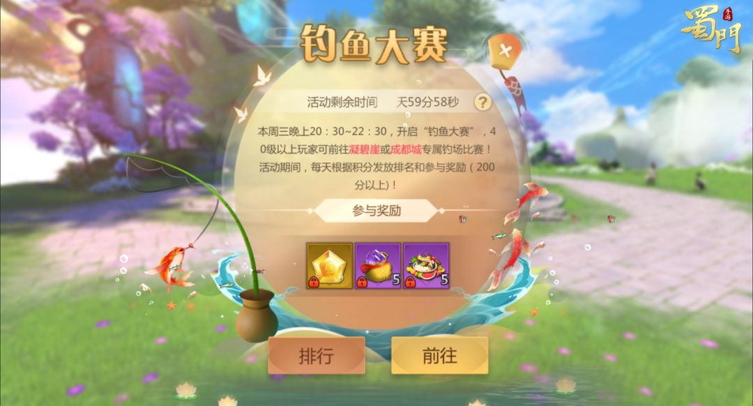 活动内容:活动期间,可前往凝碧崖或成都城专属钓场比赛, 在钓鱼大赛中不消耗鱼竿耐久也不消耗鱼饵,所以带上最好的鱼竿去征程吧。