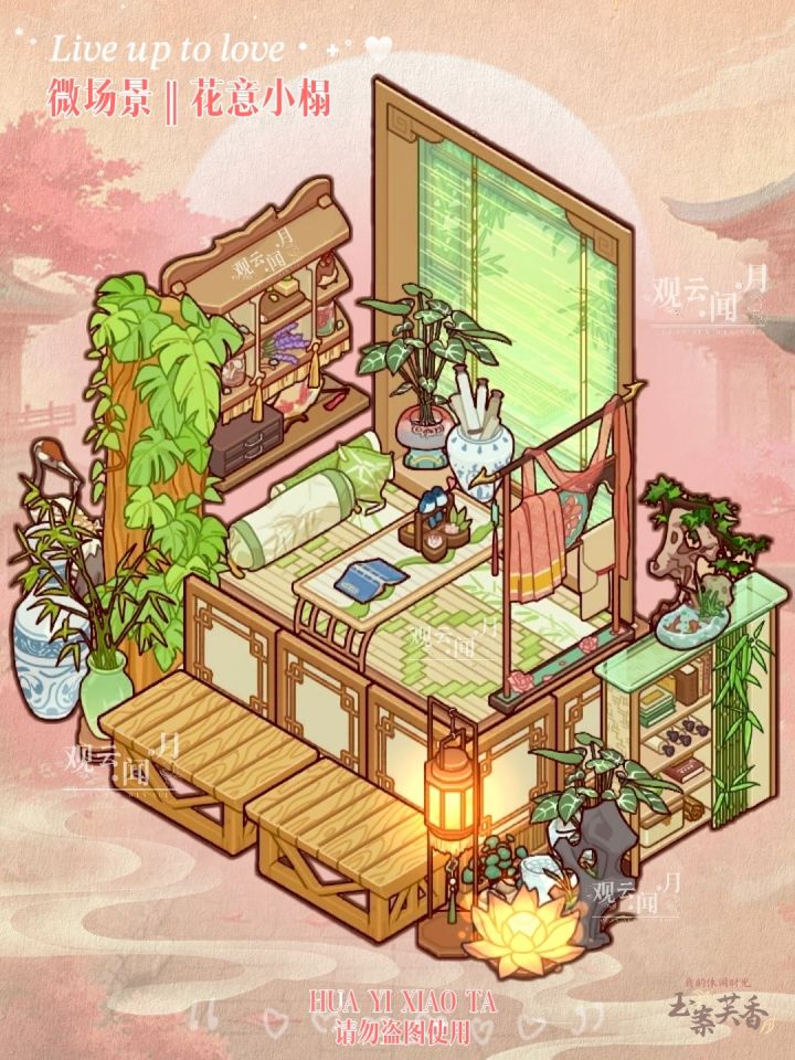 ✦用签到家具和错位原理搭一个国风小榻。根据主题来搭建一则微场景,灵感来自玩家『万星塔塔』的教程。