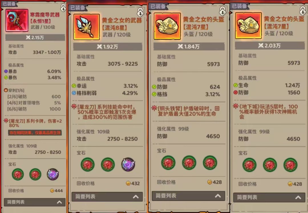 下层四件:屠龙出卡几率必带,然后神带背带裤和铜头铁臂这两个可以合成幻影屠龙和盘龙的,然后其中一个有望合成成功后,换成血瓶卡、神赐刷新+1(当前版本未生效)、魔盒。