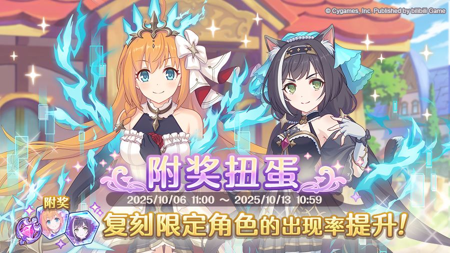 在附奖扭蛋中,期间限定角色「佩可莉姆(超负荷)」、「凯露(超负荷)」的出现概率将进行提升!此外,还可获得额外奖品报酬。