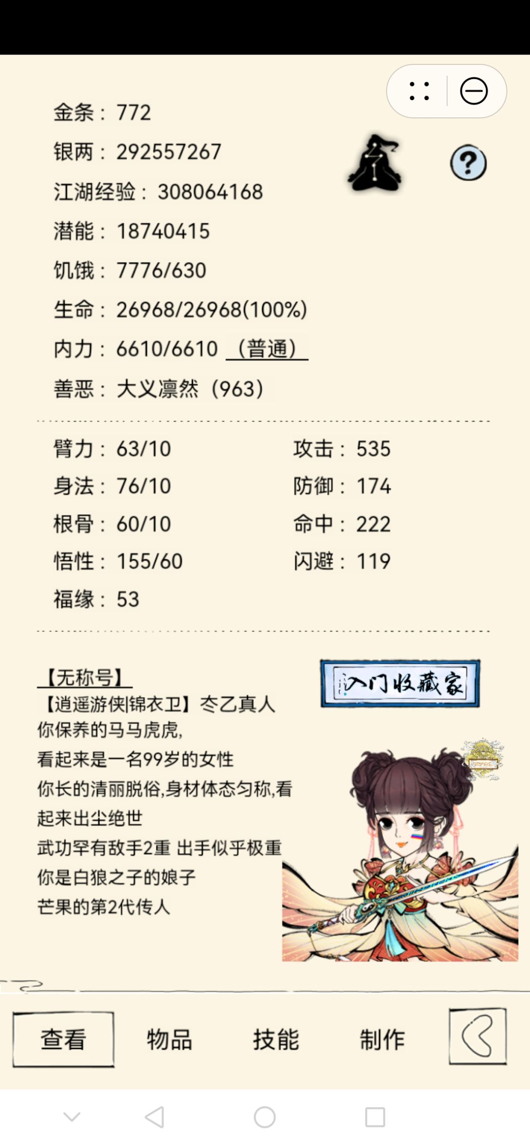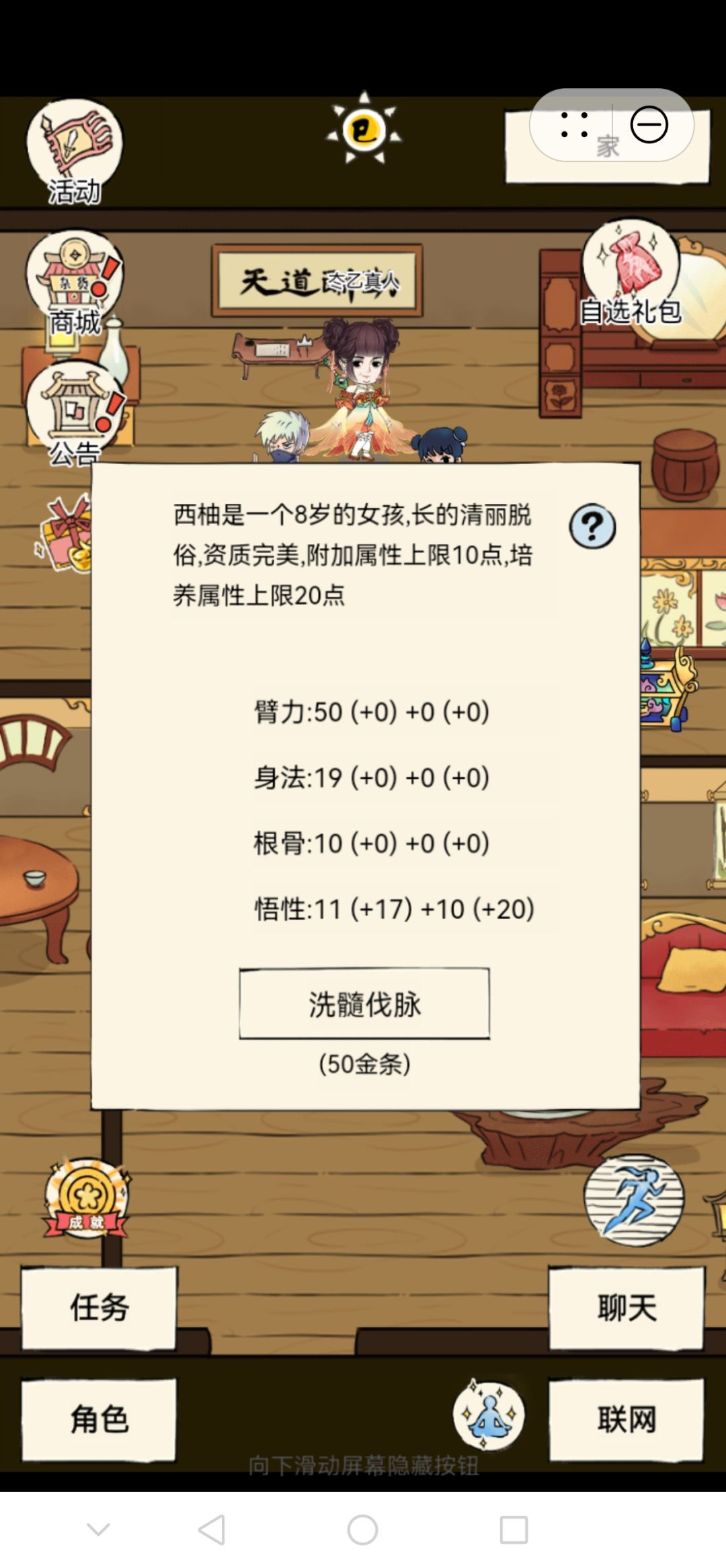 娱乐:天龙八音(悟性)/小李飞刀(辅助·信手留情);灵犀剑法(已领悟),二轮原为身法剑,由平二指大力配合洗髓后,终为悟性剑(配图为待三次轮回的女儿),小小号三出师就可以了。