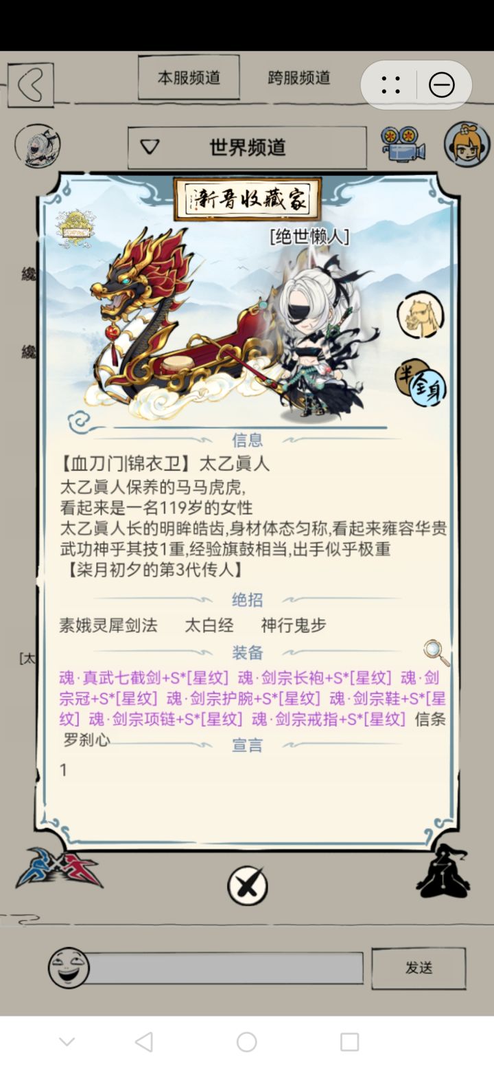 主玩:600灵犀剑法(已领悟)/飞雪剑法(已领悟)+400太白经+485神行鬼步;装备:全锻魂·魂晶·真武七截剑+S(星纹)·七件套;